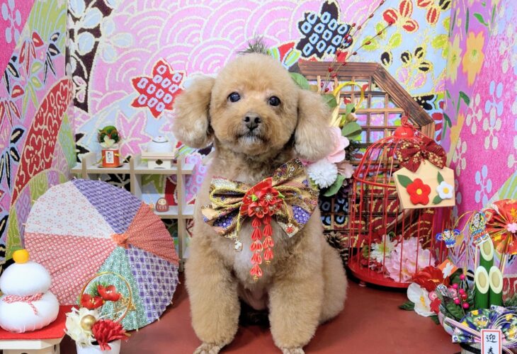 トリミングサービスご利用のお客様にお渡しするプレゼントフォト。毎月1日にテーマが変わる当店自慢のハイクオリティな撮影ブース。